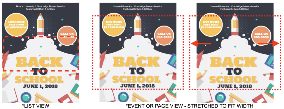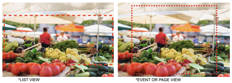 When placed into the app, the photo is cropped and zoomed in two possible ways: first in the list view and second in the event or page itself. The red lines below show approximate cropping for each usage location.
